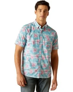 - Look good while venturing out in the evening wearing the Ariat® Monroe Stretch Modern Fit Shirt. It features point collar, front button closure placket, and patch pocket on the left chest. A regular fit, shirttail hemline, and allover leafy prints make this shirt a perfect piece for your vacations in the natural escape.