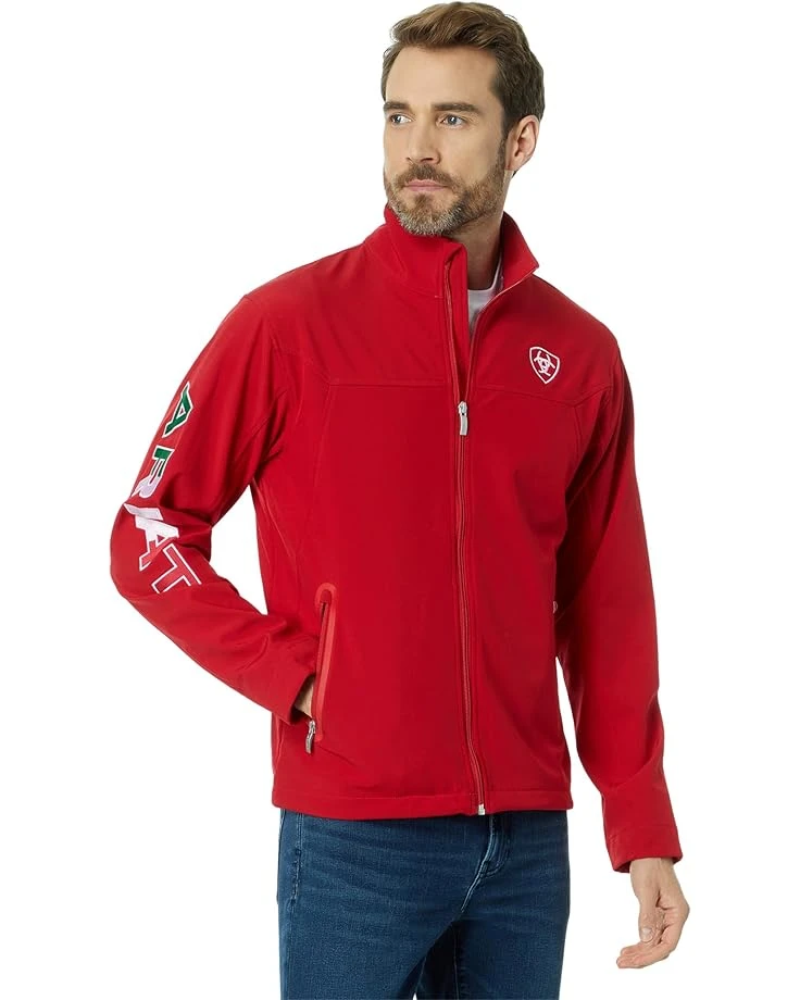 - Add the perfect layer of warmth and comfort in the Ariat® New Team Softshell Mexico Water-Resistant Jacket. Featuring a front zipper closure, long sleeves, front zipper hand pockets, and a straight hem.