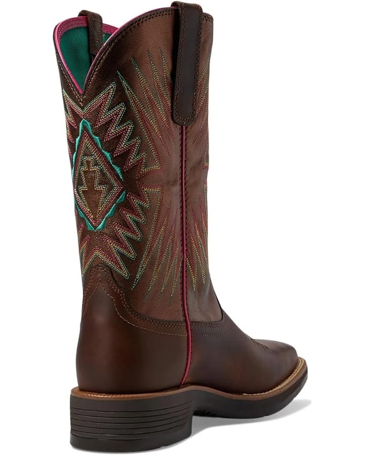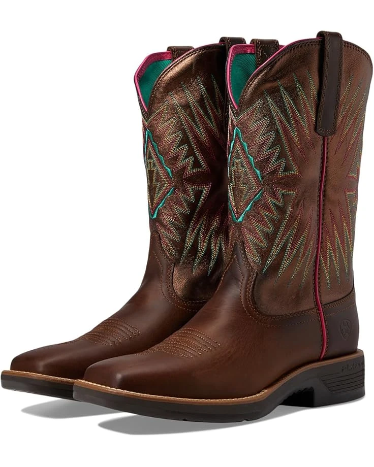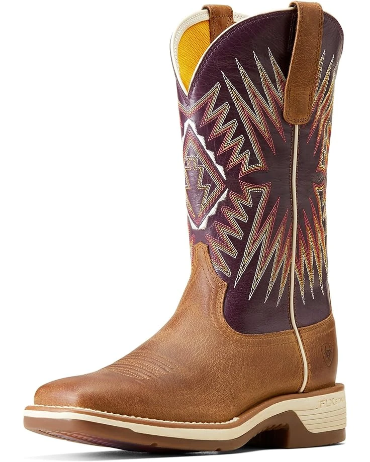 - Step into a cozy and breathable comfort by wearing Ariat® Ridgeback Western Boot. The boot features a broad square toe to let your fingers adjust well. Pull tabs ensure easy on/off. The boot is made of leather upper with western stitching on the shaft that adds a whole lot of style. A double-stitched welt, stockman heel, and a brown shaft with purple overlay and multicolored stitching give new color to your steps.