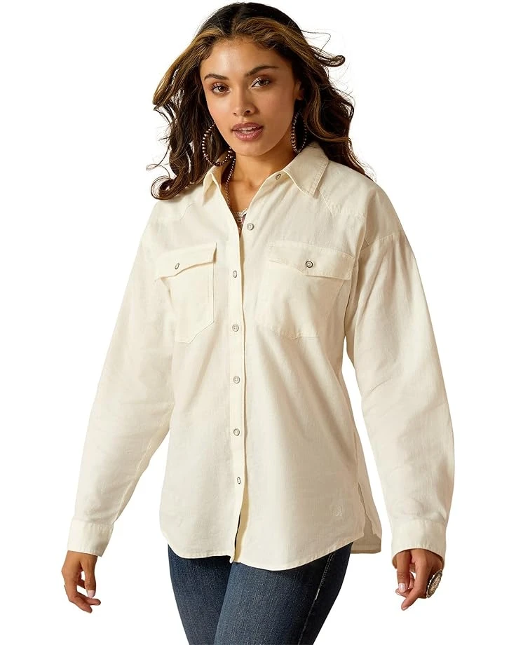 - Elevate your style statment by dressing up in the Ariat® Wilkes Blouse Shirt, that comes in a relaxed-fitted silhouette. The shirt features a collared neck, full-button closure, dropped shoulders, long sleeves with buttoned cuffs, two button-through flap pockets on the chest, and a curved hem with side splits.